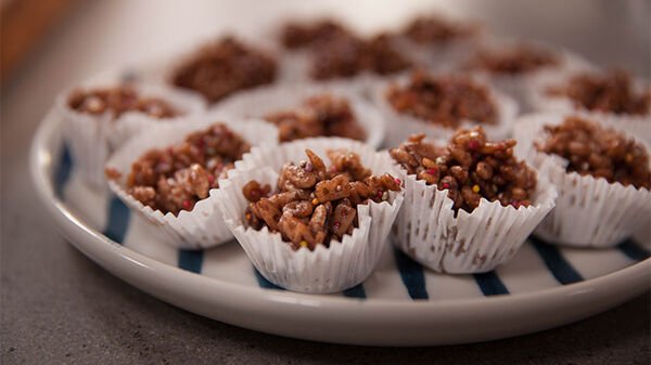 Pour cocoa into bowl and gently combine together. Using a tablespoon per patty case, divide mixture evenly amongst patty cases. Then place into fridge to set.