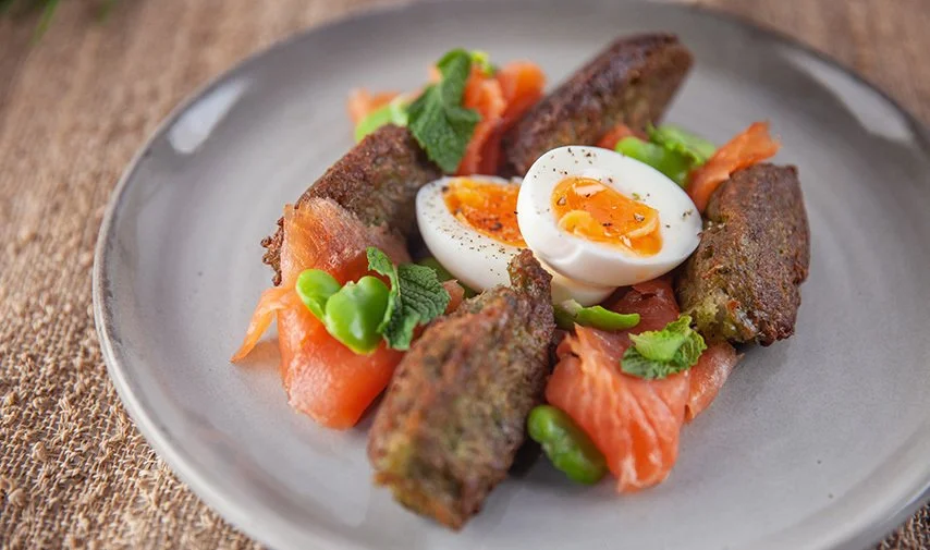 Add picked mint leaves, cumin, lemon zest, and an egg. Season with salt and pepper and pulse 4-5 times to mix. Roughly chop the remaining broad beans and fold through.