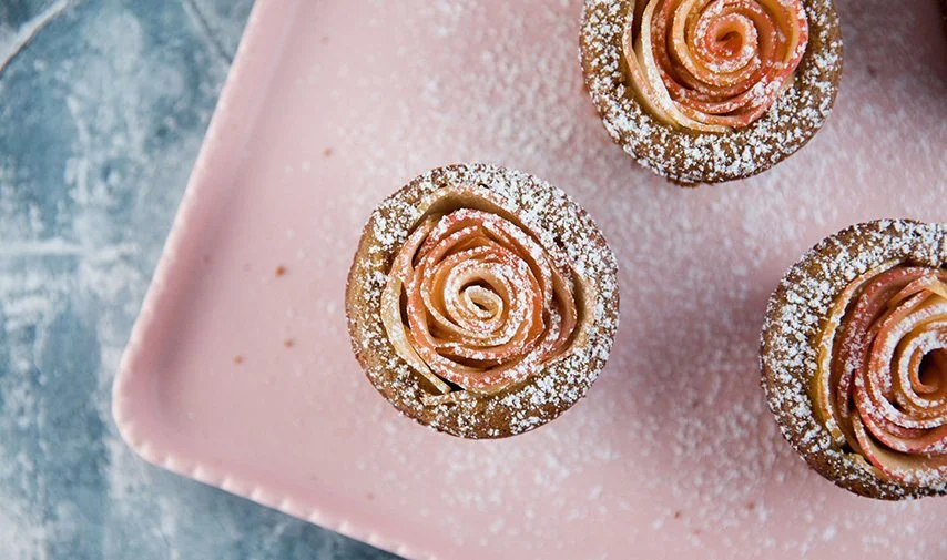 Spoon 1 scant tablespoon of cake batter into each muffin cup, making a little well in the centre of each as you go. Now, working one by one, spoon 1 teaspoon of the date and almond butter mixture into the wells and immediately top with an apple rose, pushing the rose down firmly when you place it into the batter. Don’t spoon all of the almond butter mixture into all the muffins first and the top with the roses, as the butter will run to the edges and you’ll miss out on the ooey gooey centre.