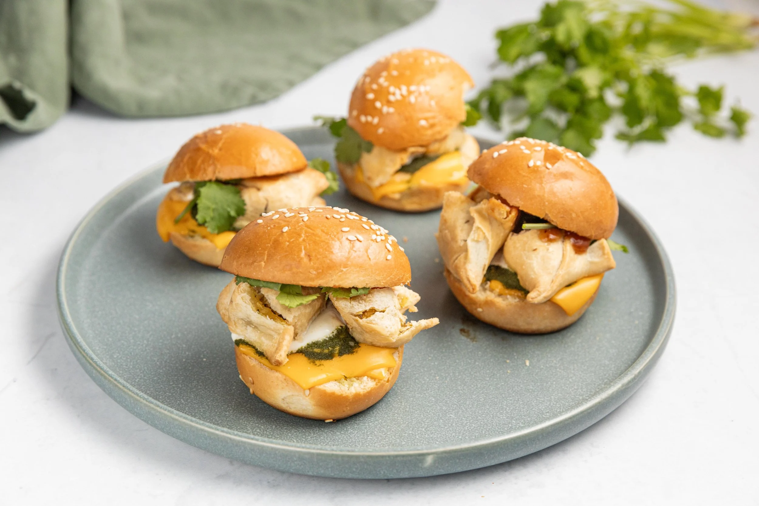 Cut the buns in half. Add cheese (2-3 pieces per bun) to the base. Place in a dry pan over a low heat with a lid to melt the cheese. Alternatively, place in the microwave for 10 seconds.