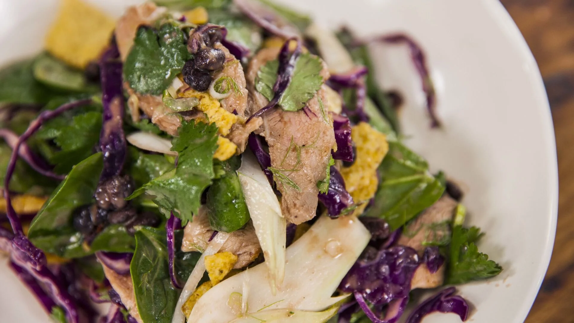 Toss together the cabbage, spinach, beans, spring onions, coriander and duck with ¾ of the dressing. Add the chips and finish with remaining sauce.