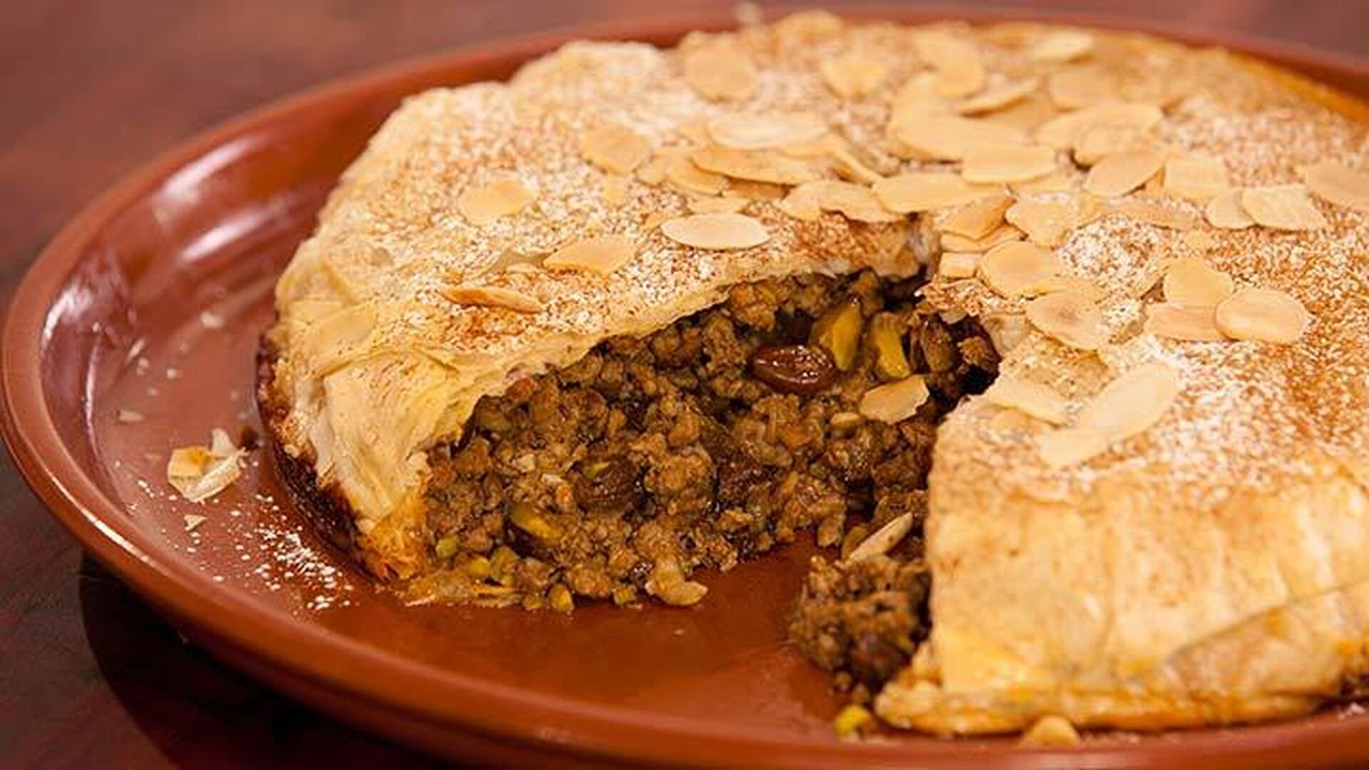 With a pastry brush baste the bottom of a 20cm (approx.) pie dish. Line with the first layer of pastry and brush again with butter. Repeat this process, so you eventually have two layers. Add the meat mixture and top with two lay¢ers of buttered filo. Seal well at the edges by tucking into the pie dish.