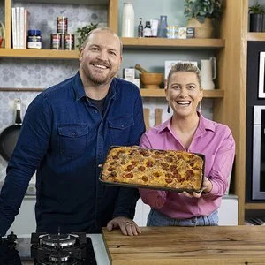 Now carefully stretch the dough into the shape of the tray, letting the weight of the dough do the work.