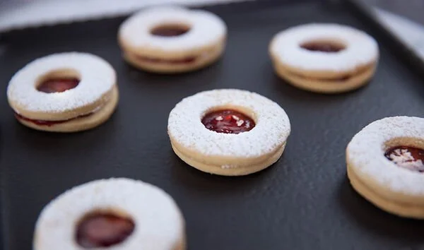 Let the sablés biscuits cool down on a rack. Spread a teaspoon of jam over the 9 sablés discs. Lightly dust the 9 rings with icing sugar, then sandwich on top of the jammed biscuits.