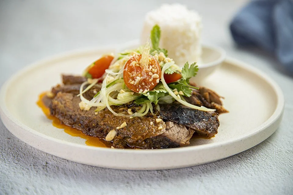 Place lemongrass stalk into a baking dish. Spread the curry paste all over the brisket, season with salt and place the fat side of the brisket up on top of the lemongrass. Pour coconut milk and 500ml of water into the tray. Cover with a scrunched-up piece of baking paper and then tightly cover with two sheets of foil and cook for 6-7 hours or until very tender. You’ll know it’s tender when it has a slight wobble and a spoon can be pushed into meat easily. Remove foil and baking paper and cook for a further hour to form a darker crust.