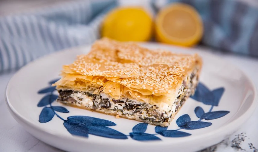 Add the cooled kalettes and spinach to the cheese mixture and fold together. Add to the fillo-lined baking dish and spread evenly to the edges. Fold the excess fillo on top of the mixture and press down to tuck it in. Brush extra butter over the top and sprinkle with sesame seeds.