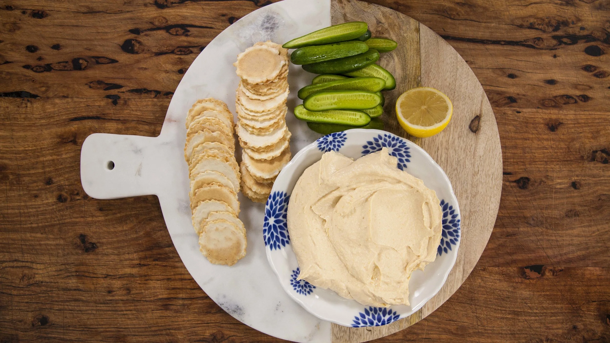 With the motor still running, very slowly drizzle in the oil. Continue this process until a light and fluffy dip is created. Taste to check seasoning, add extra lemon juice as needed.
