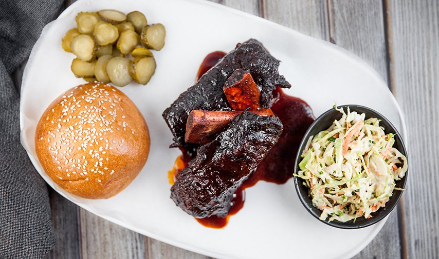 Bring the cooking liquor to the boil and thicken. Pour the sauce over the ribs and serve with slaw, pickles and soft bread rolls.