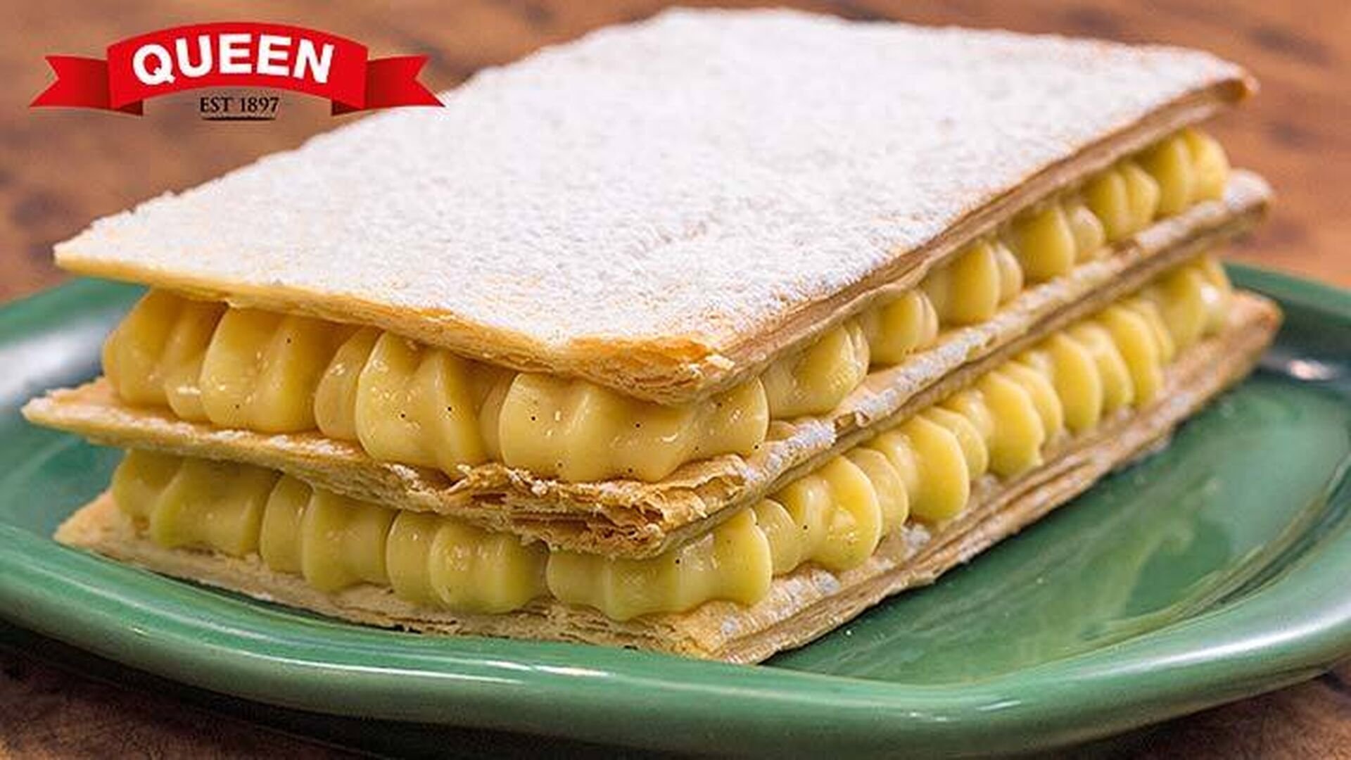 Spread vanilla custard into a piping bag, dollop on one rectangle of pastry, sandwich with another. Before serving, sprinkle with icing sugar!